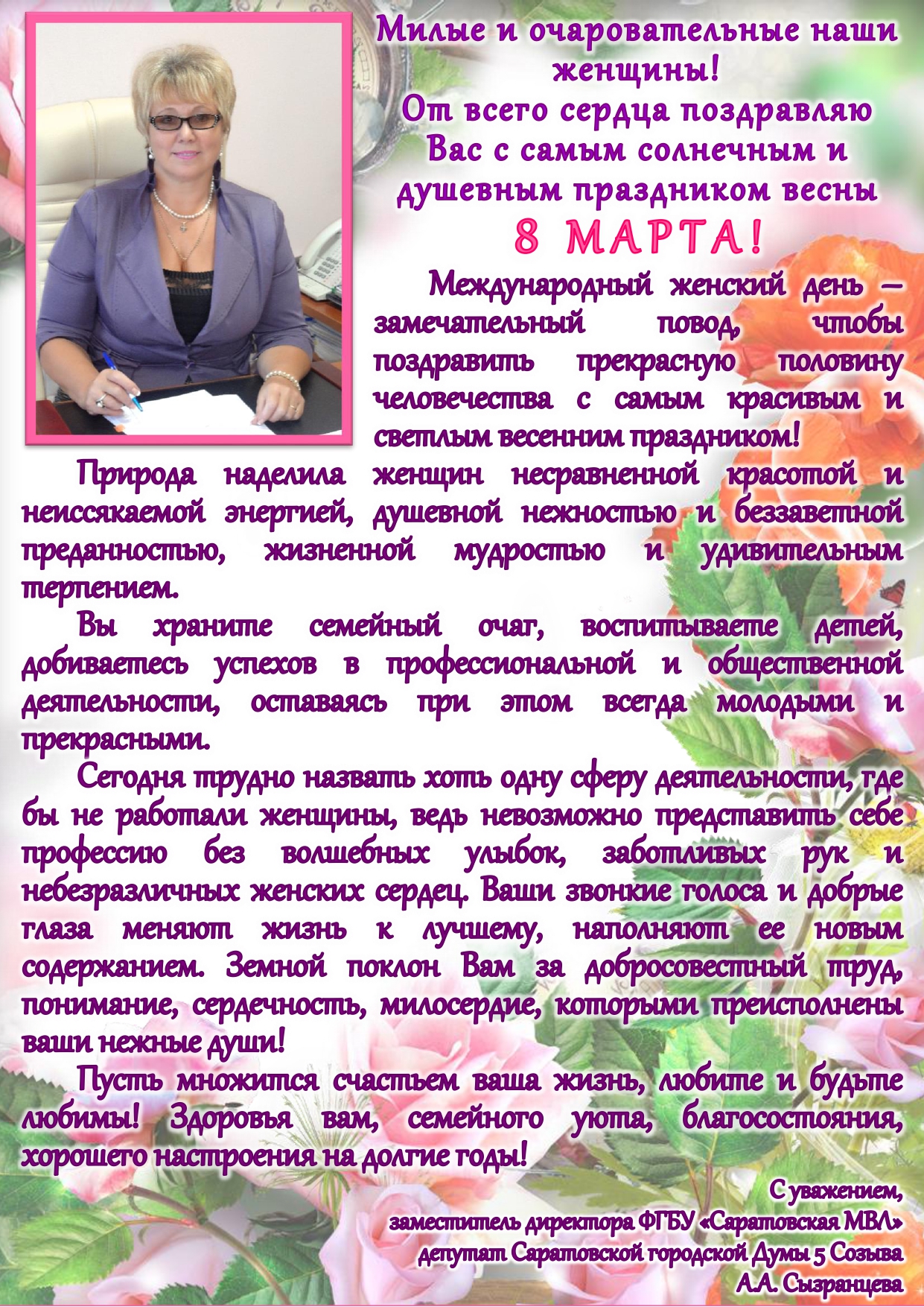 Депутат Саратовской гордумы Александра Сызранцева поздравляет женщин с душевным праздником весны