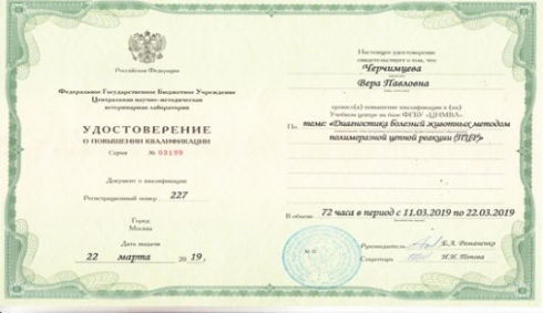 Повышение квалификации проходило в учебном центре на базе ФГБУ «Центральная научно-методическая ветеринарная лаборатория» (ФГБУ ЦНМВЛ) по теме: «Диагностика болезней животных методом полимеразной цепной реакции».