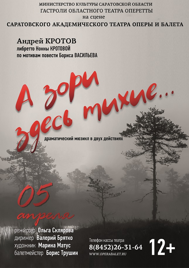 Саратовскому зрителю будет показан драматический мюзикл в 2-х действиях «А зори здесь тихие». Полуторачасовой мюзикл новосибирского композитора Андрея Кротова был создан по мотивам знаменитой повести Бориса Васильева, уже ставшей классикой жанра военной литературы. Это драматическая история девушек-зенитчиц, попавших на войну, неоднократно ставилась на сценах крупнейших драматических театров страны, которая легла в основу нескольких экранизаций и стала сюжетом сразу двух опер.