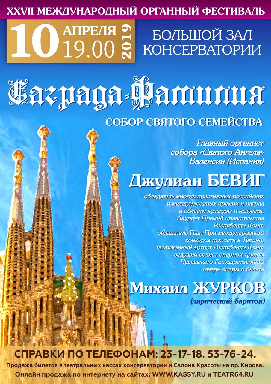 10 апреля в Большом зале консерватории на 27м Международном органном фестивале номинант-победитель ежегодной региональной премии «Лучшие из лучших Саратовской губернии -2018» в номинации «Её величество сцена. Триумф» Михаил Журков выступит с органистом Джулианом Бевигом в праздничной программе - «САГРАДА ФАМИЛИЯ. Собор Святого семейства». Обладатель многих престижных российских и международных премий и наград в области культуры и искусств, Лауреат Премий правительства Республики Коми, обладатель Гран-При международного конкурса искусств в Турции, заслуженный артист Республики Коми, ведущий солист оперной труппы Чувашского Государственного театра оперы и балета Михаил Журков готовит специально для этого концерта редкоисполняемые европейские арии. Джулиан Бевиг родился 31 августа 1969 года в столице Перу – Лиме. Первые уроки игре на органе брал у кафедрального органиста Кёльна Андреаса Мейснера. Закончил курс обучения соборной музыки в консерватории Эссена (Германия). Стажировался 3 года исполнению романтической органной музыке в Роттердамской консерватории (Нидерланды). Лауреат международных конкурсов органистов в Германии, Франции и Нидерландах как органист и импровизатор. Гастролирует по Европе, США и Австралии. Преподавание органа в Кёльнской высшей школе музыке в качестве приглашённого профессора он совмещает с должностью главного органиста в соборе «Святого ангела» в г. Валенсии (Испания). В исполнении Дж. Бевига прозвучит сольная органная классика Баха и редко исполняемые в России сочинения испанских композиторов. Концерт продолжится популярными старинными ариями в дуэте с признанным лирическим баритоном Михаилом ЖУРКОВЫМ.