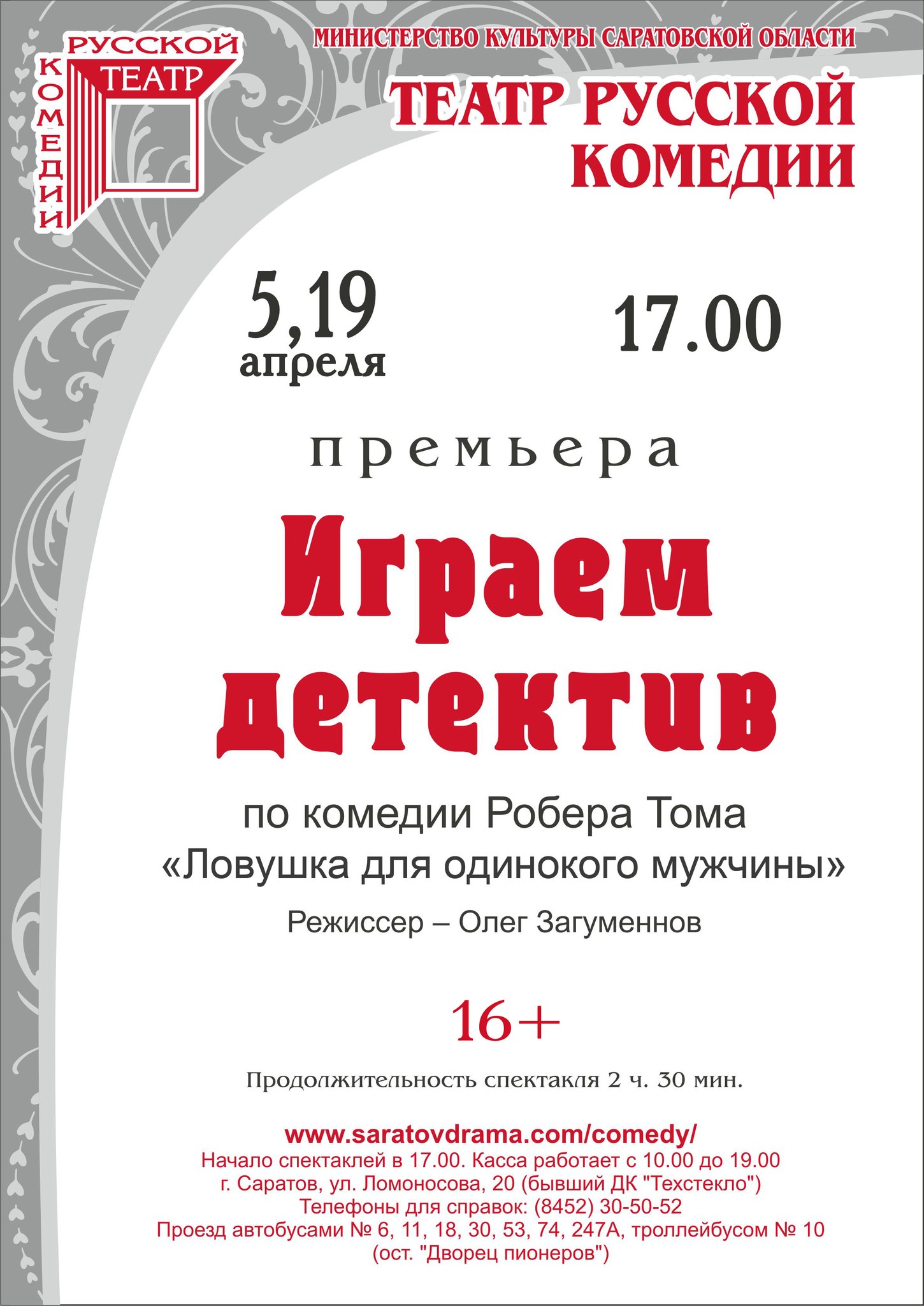 5 апреля в Театре русской комедии премьера спектакля «Играем детектив» по пьесе Робера Тома «Ловушка для одинокого мужчины».