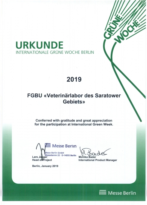 По приглашению Правительства Саратовской области и Министерства сельского хозяйства Саратовской области, исполняющая обязанности директора ФГБУ «Саратовская МВЛ», депутат Саратовской городской Думы А.А. Сызранцева в составе официальной делегации Саратовской области, приняла участие в работе 84-ой Международной торговой выставки пищевой промышленности, садоводства, сельского и лесного хозяйства «Зеленая Неделя-2019» в период 17-19 января 2019 года в городе Берлин, Федеративной Республики Германия.