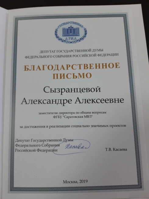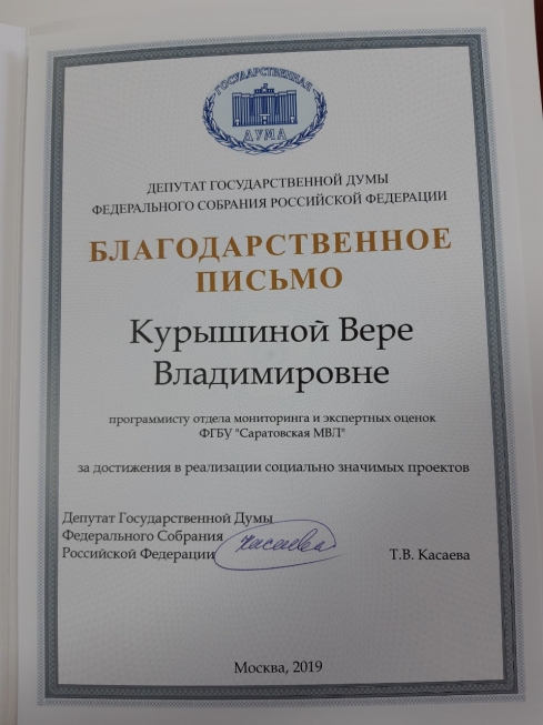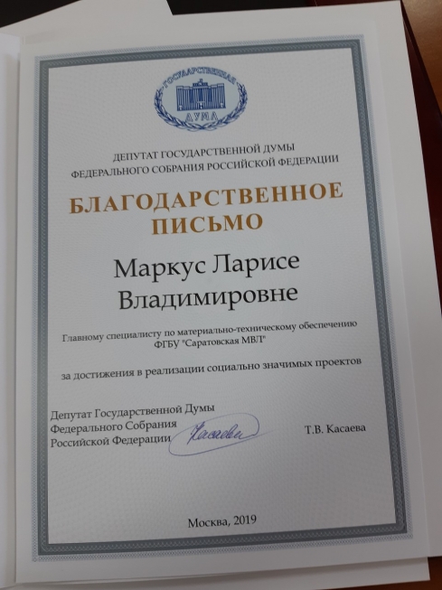 На собрании были вручены благодарственные письма от депутата Государственной Думы ФС РФ Касаевой Т.В. За достижение в реализации социальной значимых проектов были отмечены четыре члена совета первичного отделения: Сызранцева Александра Алексеевна, Игонькин Александр Викторович, Маркус Лариса Владимировна и Курышина Вера Владимировна.