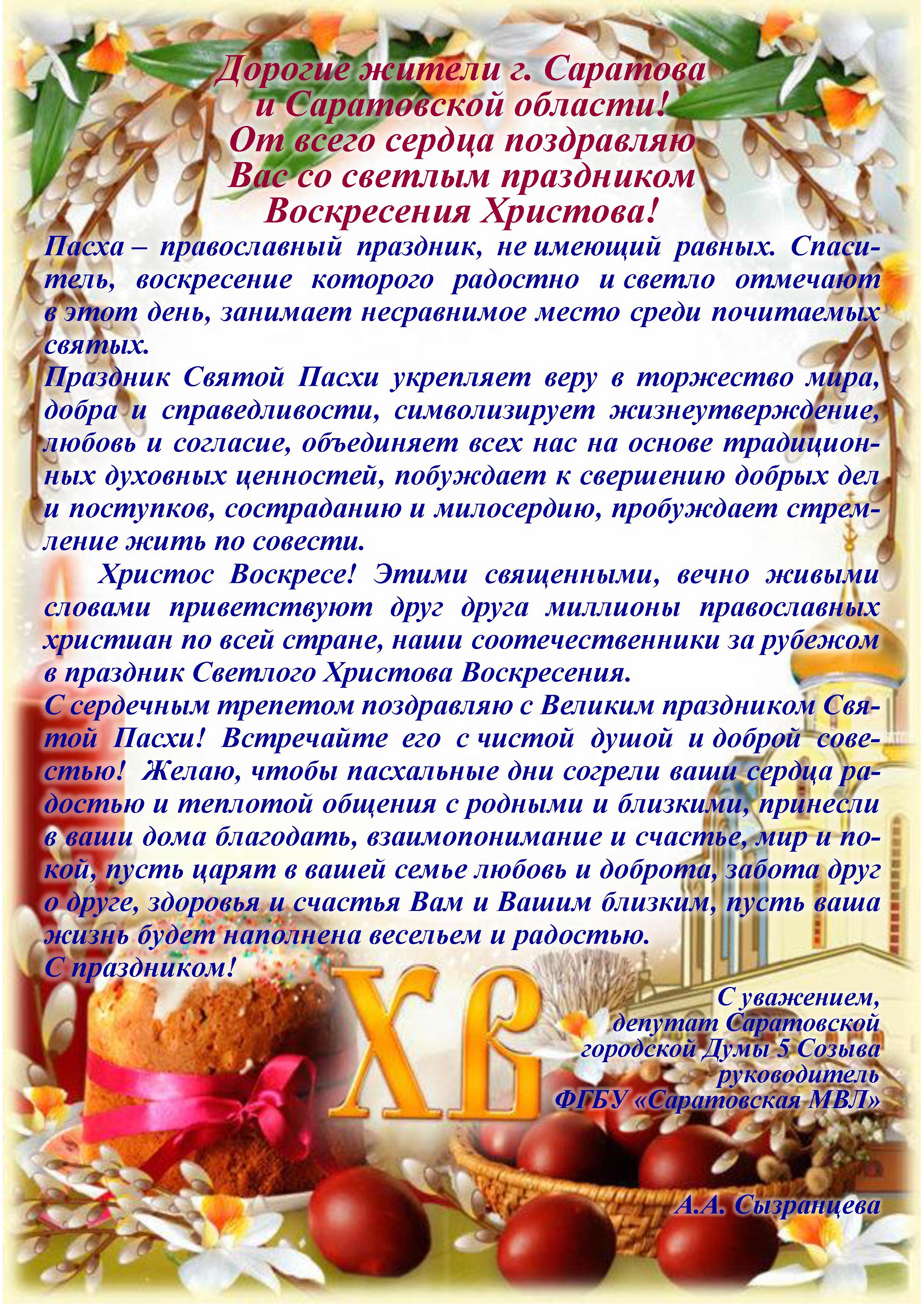 Депутат Саратовской гордумы Александра Сызранцева поздравляет саратовцев с Пасхой