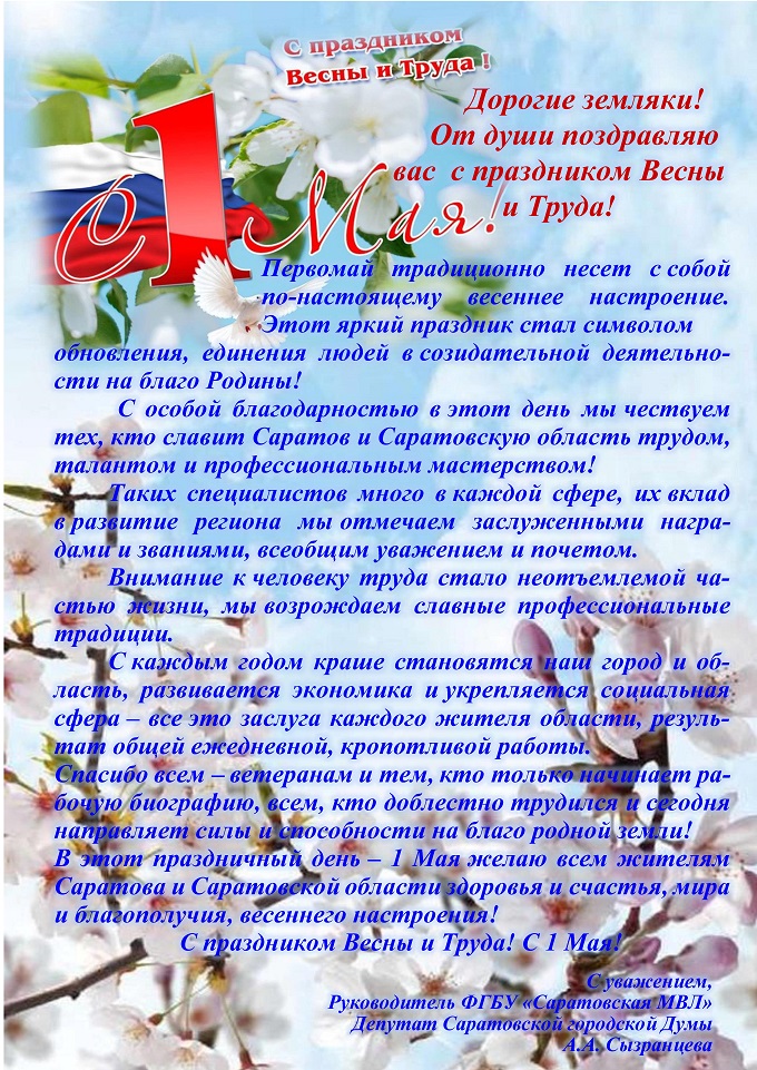 Депутат Александра Сызранцева поздравляет саратовцев с праздником 1 Мая