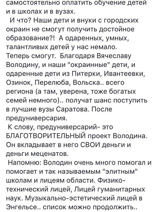 Напомню: Володин очень много помогал и помогает и так называемым "элитным" школам и лицеям области. Физико-технический лицей, Лицей гуманитарных наук. Музыкально-эстетический лицей в Энгельсе.. список можно продолжить..