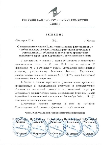 05 июня 2019 г. вступило в силу Решение Совета Евразийской экономической комиссии от 29 марта 2019 г. № 31 «О внесении изменений в Единые карантинные фитосанитарные требования, предъявляемые к подкарантинной продукции и подкарантинным объектам на таможенной границе и на таможенной территории Евразийского экономического союза».