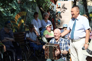 Обратили внимание на чудесные кованые изделия, оригинально украшенные цветочными композициями. Эти удивительные работы выполнены руками проживающих третьего корпуса, которые подарили свое творение пожилым людям из первого корпуса. Далее двинулись по так называемой «Дороге дружбы», объединяющей два корпуса учреждения. Здесь восхищались прекрасными цветочными клумбами, розариями разных оттенков и яркой геранью, рассматривали стенды с биографиями великих военачальников нашей страны, любовались деревянными и гипсовыми скульптурами, украшающими всю открытую территорию учреждения.