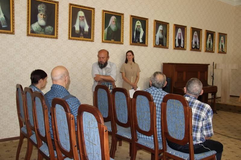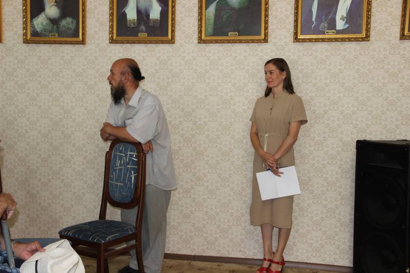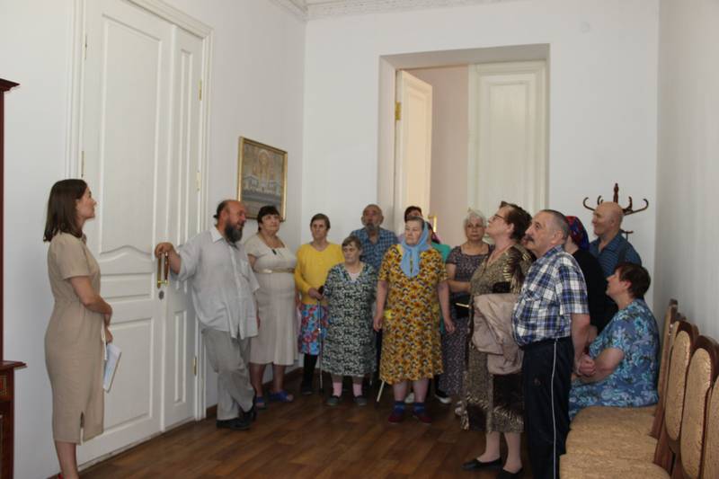 Руководитель Культурно-досугового центра Мария Андрюхина и руководитель канцелярии Епархиального управления Александр Юдин сопроводили жителей дома-интерната по комплексу зданий управления, в который входят не только официальные залы и рабочие кабинеты, но и помещения другого назначения.