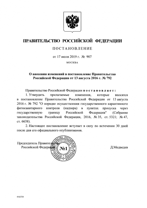 Постановлением Правительства РФ от 17 июля 2019 г. № 907 внесены изменения в Правила осуществления государственного карантинного фитосанитарного контроля (надзора) в пунктах пропуска через государственную границу РФ, утвержденные постановлением Правительства РФ от 13 августа 2016 г. № 792.
