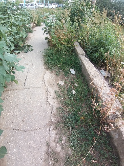 Прошу привести в порядок асфальтное полотно и бордюрный камень указанного пешеходного тротуара в надлежащее состояние, согласно "нормам для пешеходных улиц", убрать мусор и покосить траву на самом тротуаре и вблизи него.