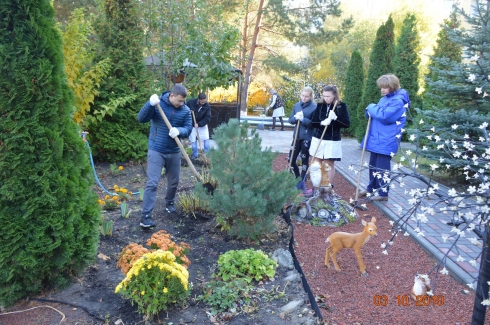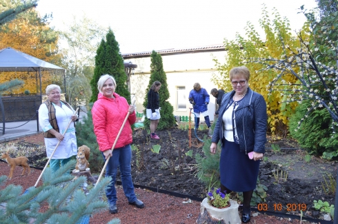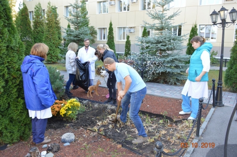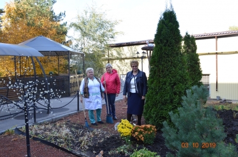 В теплый и погожий октябрьский день высажены саженцы многолетних цветов, подготовлены к предстоящим осенним холодам небольшой декоративный пруд на территории и фонтан перед зданием учреждения.