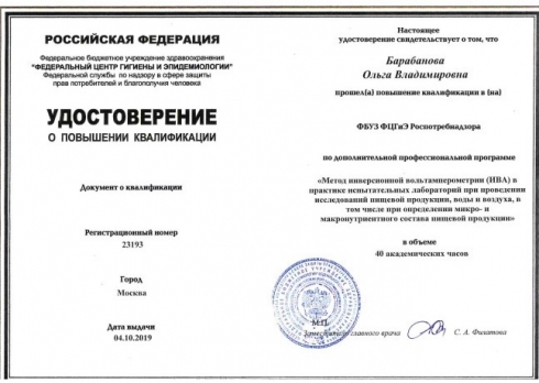 Токсиколог отдела химических исследований с 30 сентября по 4 октября 2019 г. прошла курсы повышения квалификации, на базе ФБУЗ ФЦГиЭ Роспотребнадзора в г. Москва по теме: «Метод инверсионной вольтамперометрии (ИВА) в практике испытательных лабораторий при проведении исследований пищевой продукции, воды и воздуха, в том числе при определении микро- и макро-нутриентного состава пищевой продукции».