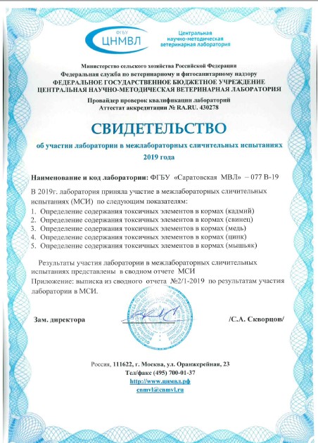 За 9 месяцев 2019 года ФГБУ «Саратовская МВЛ» было принято участие в межлабораторных сличительных испытаниях (МСИ) по основным направлениям деятельности учреждения.
