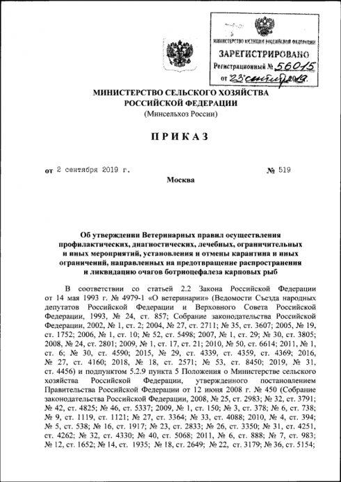 Приказом Министерства сельского хозяйства РФ от 02 сентября 2019 г. № 519 утверждены Ветеринарные правила осуществления профилактических, диагностических, лечебных, ограничительных и иных мероприятий, установления и отмены карантина и иных ограничений, направленных на предотвращение распространения и ликвидацию очагов ботриоцефалеза карповых рыб.