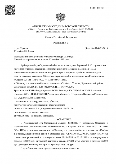 В результате проведения экспертизы экспертами Учреждения подготовлено экспертное заключение, направленное в Арбитражный суд Саратовской области.