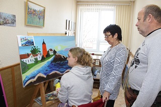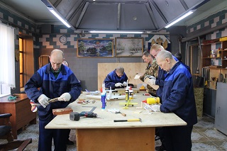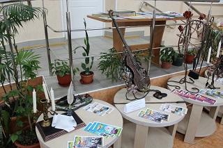Гости посетили слесарную и столярную мастерскую, где молодые люди занимались созданием кованных и деревянных шедевров. Настоящее изумление вызвала выставка изделий из металла, изготовленных методом холодной ковки: композиция со скрипкой и смычком «Мелодия металла», подсвечник с пером и листом бумаги «О сколько нам открытий чудных…», пепельница «Черная слеза», кашпо под цветы «Виноградная лоза», подсвечник «Осенний вальс».