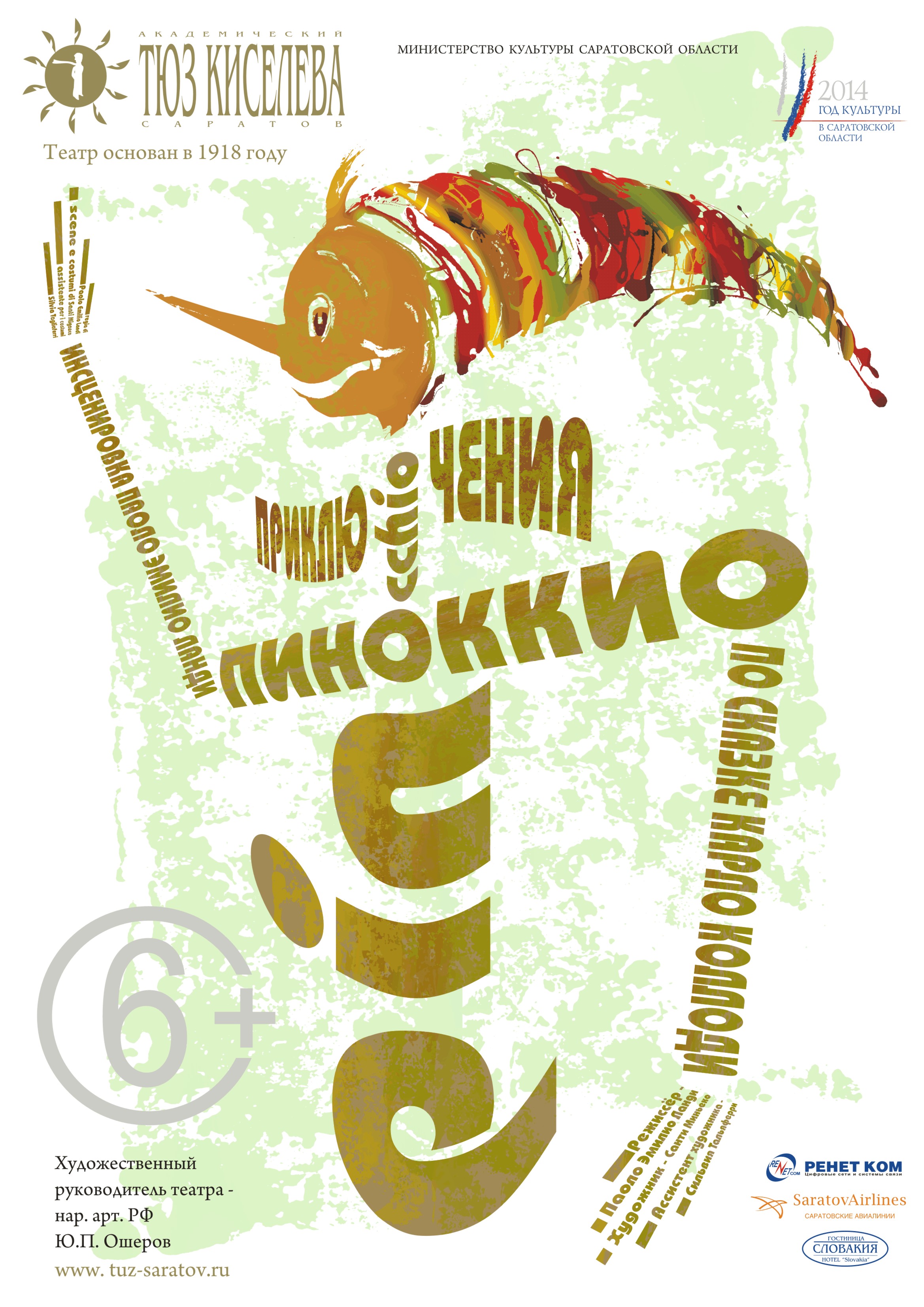 15 мая 2014 г. в 18-00 на Большой сцене Саратовского театра юного зрителя им. Ю.П. Киселева состоится премьера спектакля «Приключения Пиноккио» (инсценировка Паоло Эмилио Ланди по сказке Карло Коллоди). Режиссёр - Паоло Эмилио Ланди (Италия), художник-постановщик - Санти Миньеко (Италия).