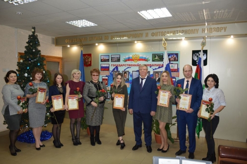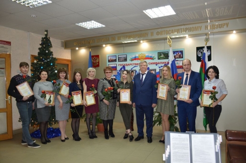 В завершении собрания, за хорошие показатели в работе и добросовестный ответственный труд руководитель территориального управления А.В. Игонькин и директор лаборатории А.А. Сызранцева вручили наиболее отличившимся специалистам ФГБУ «Саратовская МВЛ» благодарственные письма, почетные грамоты и цветы. Почетными грамотами Управления Россельхознадзора по Саратовской области были награждены начальник организационно-правового отдела Губко П.Ю., начальник отдела компьютерного обеспечения и защиты информации Рязанцев Е.М. и начальник сектора контрактной службы Акимова М.П. Почетными грамотами и благодарностями ФГБУ «Саратовская МВЛ» были отмечены 12 специалистов лаборатории.