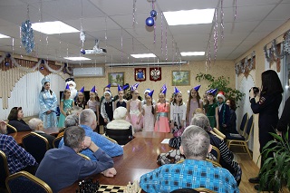 Юные артисты порадовали старшее поколение веселым новогодним представлением, в котором рассказали стихи о зиме, исполнили новогодние песни, показали озорные танцы. А Дед Мороз и Снегурочка «в погонах» поздравили всех с наступающим Новым годом и пожелали здоровья, благополучия и долгих лет жизни. В конце мероприятия самодеятельные артисты подарили сладкие новогодние подарки.
