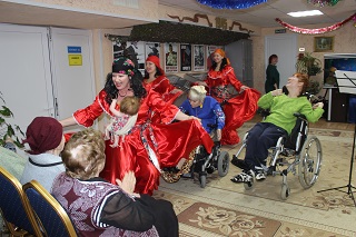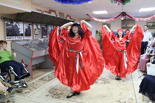Уже с утра настроение было у всех приподнятое и праздничное. Прослушав по внутреннему радио дома-интерната интересную рубрику «Из истории праздника», проживающие и сотрудники собрались вместе, чтобы от души повеселиться. Вместе с самодеятельными артистами участники гуляний пели веселые народные и лирические песни, водили хороводы, плясали, разгадывали загадки, соперничали в конкурсах и, конечно, участвовали в главном народном развлечении - колядках. Неожиданным стал выход настоящего цыганского табора, выступление которого внесло в праздник особый колорит. Старая цыганка нагадала, что в наступившем новом году каждого ждет успех, благополучие и здоровье, а кое-кого любовь и даже свадьба! По народному обычаю все колядующие получили сладкие подарки, ведь по поверью, если угостить ряженых, то будет в доме счастье и удача.