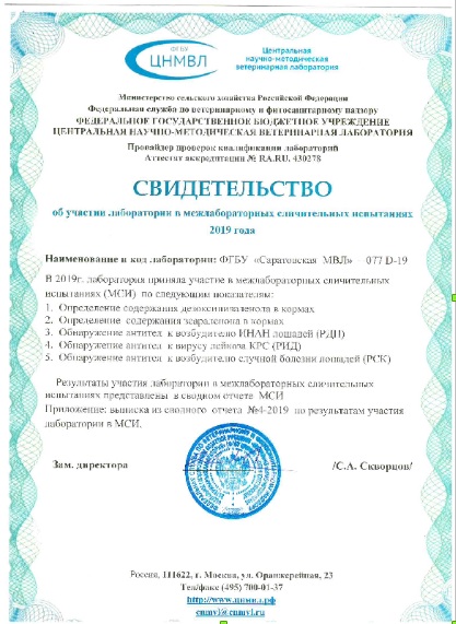 За 2019 год ФГБУ «Саратовская МВЛ» было принято участие в межлабораторных сличительных испытаниях (МСИ) по основным направлениям деятельности учреждения.