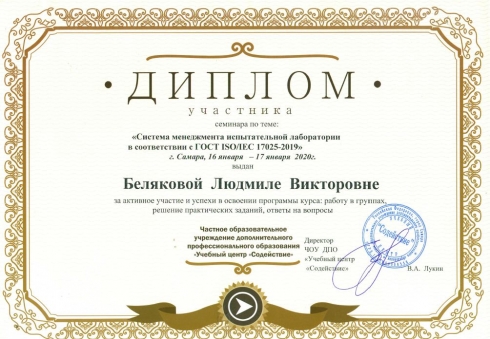 В январе 2020 года начальник отдела приема материала Белякова Л.В. приняла участие в обучающем семинаре, организованном частным образовательным учреждением дополнительного профессионального образования «Учебный центр «Содействие», г. Самара по теме: «Система менеджмента испытательной лаборатории в соответствии с ГОСТ ISO/IEC 17025-2019».