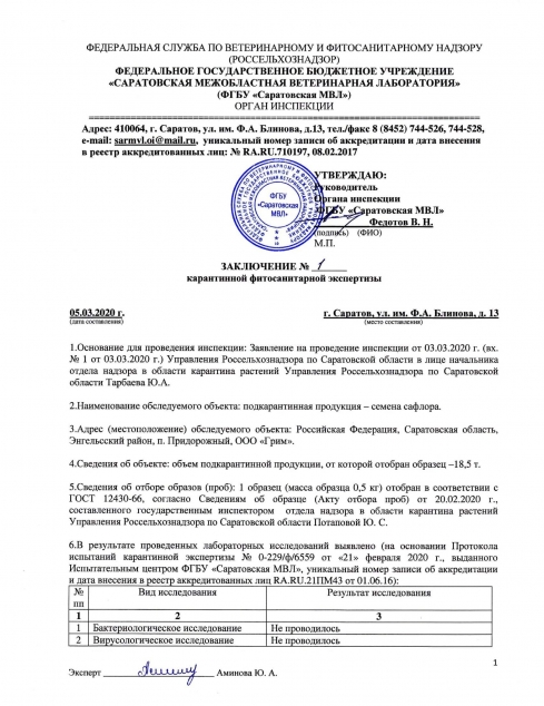 На основании обращений заказчика, целью проведения инспекций стало установление карантинного фитосанитарного состояния подкарантинной продукции (сафлора и горчицы) в соответствии с требованиями Федерального закона от 21 июля 2014 г. № 206-ФЗ «О карантине растений» на основании сведений, указанных в представленных документах.
