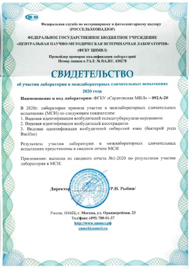 По данным сводного отчета, ФГБУ «Саратовская МВЛ» получено Свидетельство об успешном участии в межлабораторных сравнительных испытаниях. Успешные результаты МСИ являются подтверждением компетентности лаборатории, специалисты отдела бактериологии, паразитологии и микологии подтвердили высокую точность и качество проводимых исследований.
