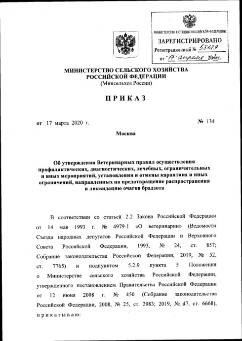 Приказом Министерства сельского хозяйства РФ от 17 марта 2020 г. № 134 утверждены Ветеринарные правила осуществления профилактических, диагностических, лечебных, ограничительных и иных мероприятий, установления и отмены карантина и иных ограничений, направленных на предотвращение распространения и ликвидацию очагов брадзота.