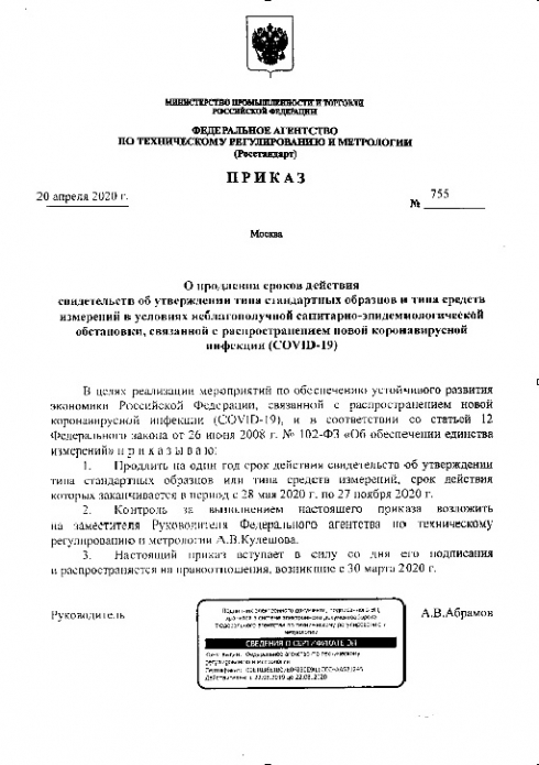 В целях реализации мероприятий по обеспечению устойчивого развития экономики Российской Федерации и в соответствии со статьей 12 Федерального закона от 26 июня 2018 г. N 102-ФЗ «Об обеспечении единства измерений» издан Приказ Росстандарта от 20.04.2020 N 755, согласно которому на один год продлен срок действия свидетельств об утверждении типа стандартных образцов и средств измерений, действие которых истекает в период с 28 мая 2020 г. по 27 ноября 2020 г.