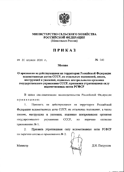 Приказом Министерства сельского хозяйства РФ от 30 апреля 2020 года № 246 в рамках реализации механизма «регуляторной гильотины» признаны не действующими на территории Российской Федерации ведомственные акты СССР, их отдельные положения, а также письма, инструкции и указания, изданные центральными органами государственного управления СССР, признаны утратившими силу ведомственные акты РСФСР по перечню согласно приложениям к приказу.