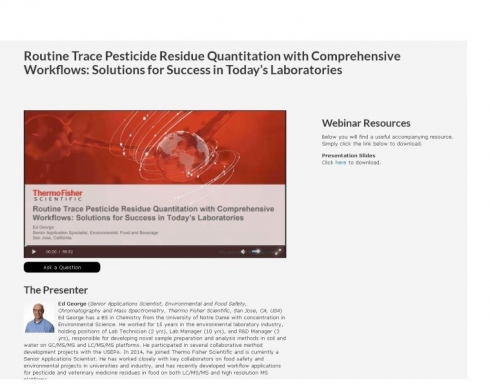 В вебинаре было представлено новое оборудование для проведения определения остаточных количеств пестицидов. Показаны разработанные компанией Thermo Fisher методы пробоподготовки и инструментального анализа.