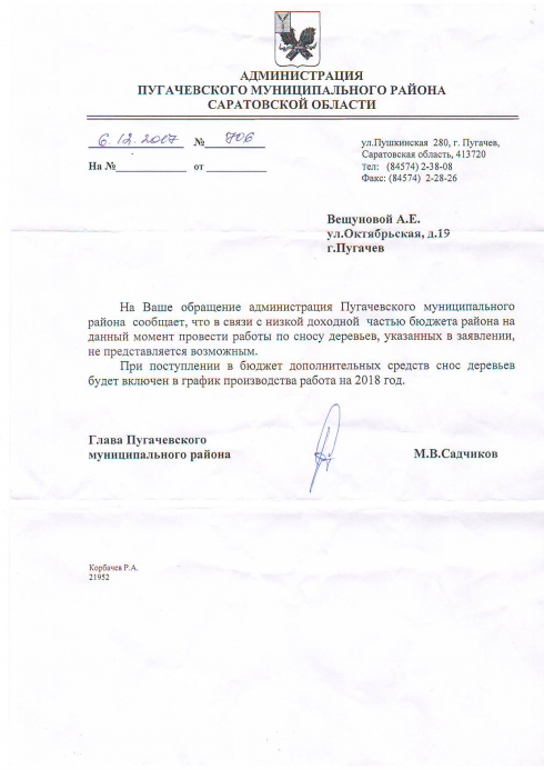 Здравствуйте. На улице Октябрьская, в доме номер 19, проживает Есипова Галина Михайловна. Пенсионерка более 30 лет отработала в Пугачевском военкомате. Около ее дома растут три огромных дерева, которые в 2017 году комиссией в администрации признаны опасными для жизни людей. С тех пор женщина не может добиться из сноса. От Вас приходят одни отписки, в которых сообщается, что нету финансов. Неужто за три года не дошла очередь до пенсионерки, которая трудилась на благо города? Прошу Вас оценить ситуацию и ускорить процесс сноса деревьев.