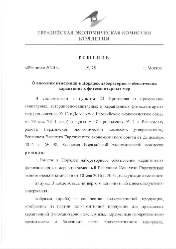 Решением Коллегии Евразийской экономической комиссии от 9 июня 2020 г. № 75 «О внесении изменений в Порядок лабораторного обеспечения карантинных фитосанитарных мер» внесены изменения в Порядок лабораторного обеспечения карантинных фитосанитарных мер, утвержденный Решением Коллегии Евразийской экономической комиссии от 10 мая 2016 г. № 41.