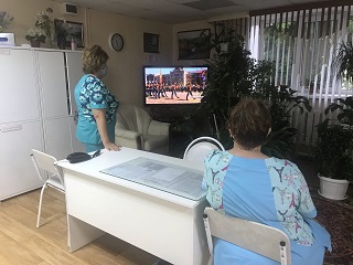 А дальше, сотрудники и проживающие трех корпусов отправились следить за этим грандиозным Парадом Победы, проходившем на главной площади нашей страны с экранов телевизоров в своих комнатах. Он-лайн трансляция также велась во всех холлах и актовом зале учреждения. Многие в этот час не могли сдерживать слезы – кто-то из них сам трудился в тылу, кто-то в эти страшные военные годы был еще ребенком, пережил эвакуацию и смерть родителей, ушедших на фронт, а кому-то пришлось испытать весь ужас нацистских концлагерей. У россиянина каждого своя боль и своя память о войне.