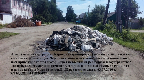 Здравствуйте Администрация г. Петровска! Здравствуйте, дорогой вы наш Денис Владиславович Фадеев! Вы быстро нас успокоили своим комментарием на нашу публикацию о плохом состоянии дороги по ул. Чернышевского, спасибо, еще 20 лет подождем....но теперь не об этом...мне лично хотелось бы знать есть ли в нашем городе настоящий хозяин или это только видимость? в данном сообщении я прилагаю фото того, как вы благоустраиваете НЕ ЦЕНТРАЛЬНЫЕ улицы нашего города, по которым вам НЕ ПРИХОДИТЬСЯ кататься. Такаго неуважения я еще не видел.. .что за помойку и что за мусор вы нам натаскали??? Кто-то в конце концов заметит ваш беспредел сверху, ну когда закончится это, КОГДА??? Я соглашусь, что мусор несут люди, но эти люди платят налоги за его вывоз!!!!! Это просто ужас! Прошу вас принять в конце концов реальные меры и не те что на фото!!!!