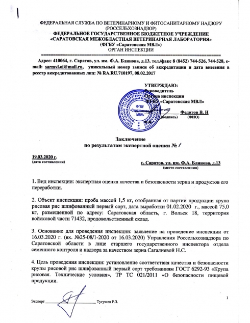 В результате проведения экспертной оценки подготовлено заключение. Заключение направлено в Управление Россельхознадзора по Саратовской области.