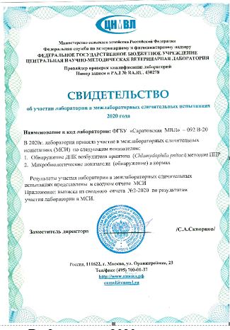 Согласно данным сводного отчета, специалисты отделов ветеринарно-санитарной экспертизы и серологии и генодиагностики полностью справились с заданиями, получив удовлетворительные результаты по всем тестируемым показателям. ФГБУ «Саратовская МВЛ» получено Свидетельство об участии в МСИ.