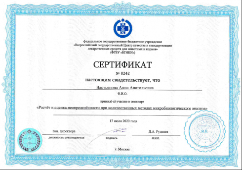 17 июля 2020 года начальник отдела ветеринарно-санитарной экспертизы прошла дистанционное обучение (в форме однодневного вебинара) по программе повышения квалификации «Расчет и оценка неопределенности при количественных методах микробиологического анализа», организованного ФГБУ «ВГНКИ» г. Москва.