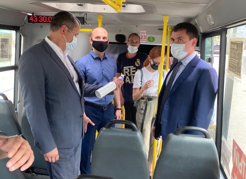 Замминистра транспорта и дорожного хозяйства Иван Козаченко, депутат гордумы Евгений Чернов, представители перевозчиков, МВД и администрации проверили соблюдение масочного режима водителями и пассажирами маршруток и трамваев в Мирном переулке.
