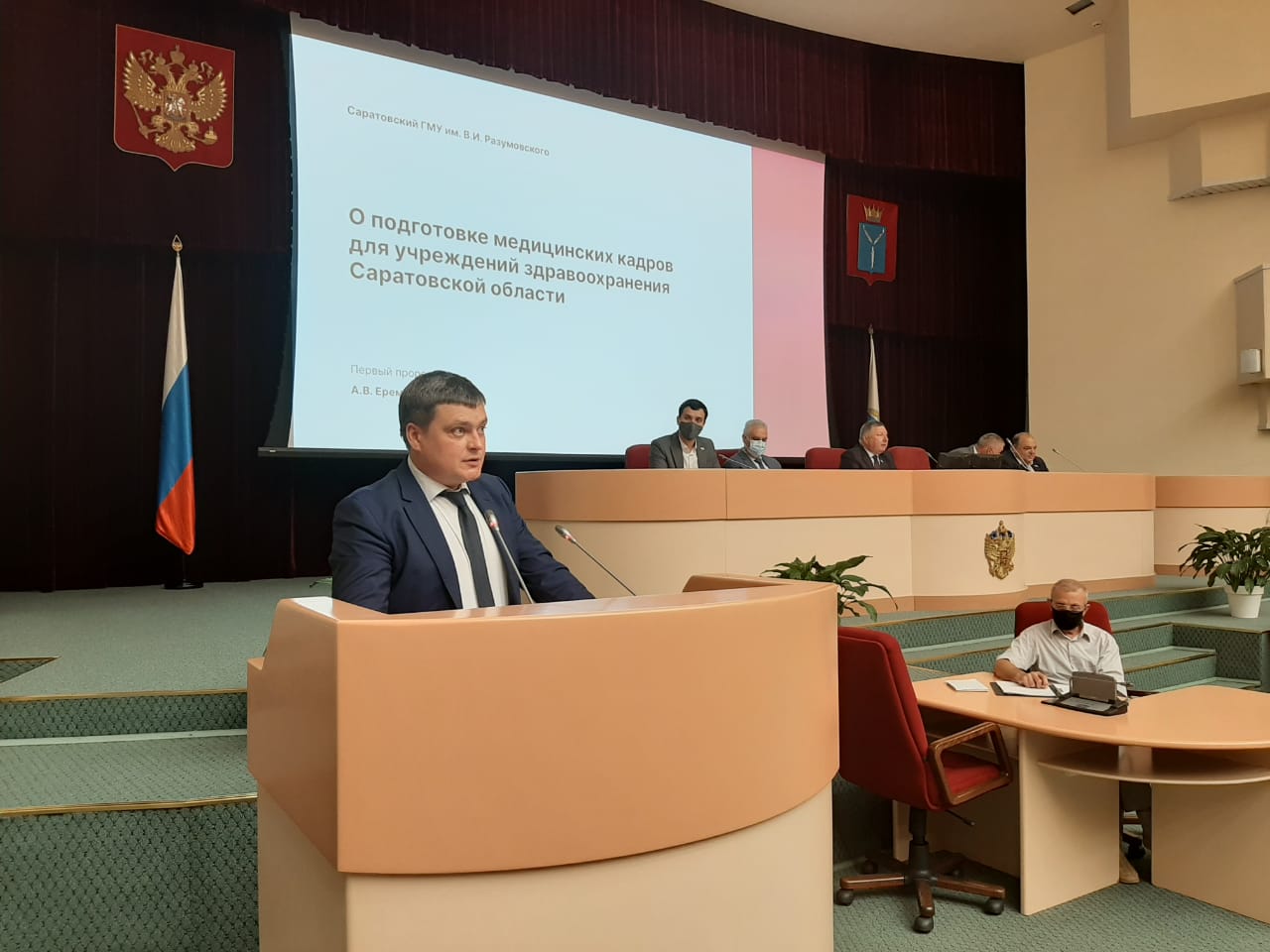 Первый проректор СГМУ им. В.И. Разумовского Андрей Еремин представил доклад, посвященный подготовке квалифицированных медицинских кадров для учреждений здравоохранения Саратовской области. Было отмечено, что основной стратегической задачей университета является реализация Национального проекта «Здравоохранение» в части ликвидации кадрового дефицита в медицинских организациях, для чего проводится системная работа, направленная на обеспечение предоставления возможности дальнейшего успешного трудоустройства всем выпускникам.