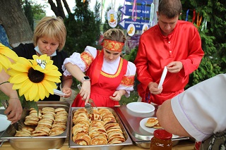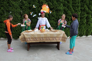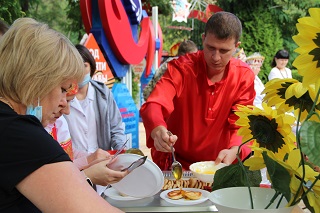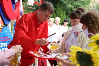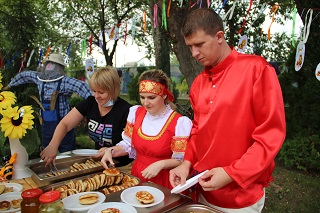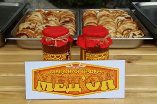 А дальше всех ждал праздничный сюрприз. На деревянных столиках с кованными ножками расположились угощения: оладушки со свежим ароматным медом, душистый чай и сладкие наливные яблоки. Каждый желающий мог вдоволь отведать каждого из сортов меда: цветочного, липового, гречишного. А самое главное - совместная трапеза и веселье по-особому сблизили и сплотили всех участников праздничного мероприятия - каждый почувствовал себя членом большой дружной семьи, живущей в одном общем гостеприимном доме.