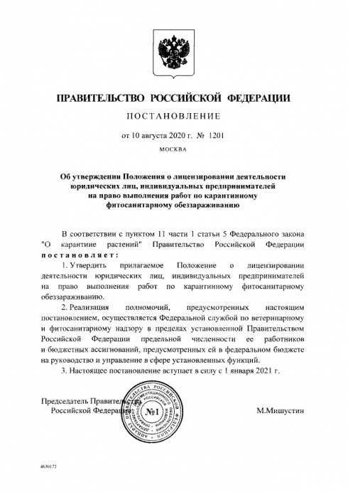 Постановлением Правительства РФ от 10 августа 2020 г. № 1201 утверждено Положение о лицензировании деятельности юридических лиц, индивидуальных предпринимателей на право выполнения работ по карантинному фитосанитарному обеззараживанию.