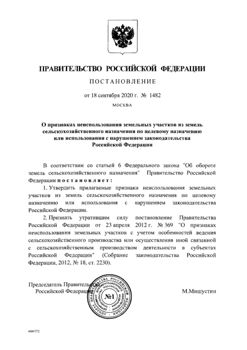 Постановлением Правительства РФ от 18 сентября 2020 г. № 1482 заново установлены признаки неиспользования земельных участков из земель сельскохозяйственного назначения по целевому назначению или использования с нарушением законодательства Российской Федерации”.