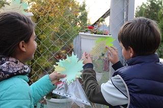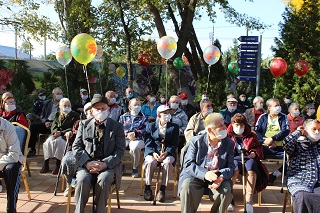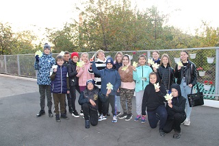 Теплая осенняя погода позвала на улицу, где всех ждал еще один сюрприз. Юные волонтеры МОУ "Гимназия № 8" Энгельсского муниципального района Саратовской области решили порадовать пожилых людей и ранним утром украсили территорию дома-интерната воздушными шарами и разноцветными бумажными листьями с теплыми пожеланиями к праздничному дню. Кроме того, дети почтили память ветеранов Великой Отечественной войны, возложив алые гвоздики на Аллее Славы.