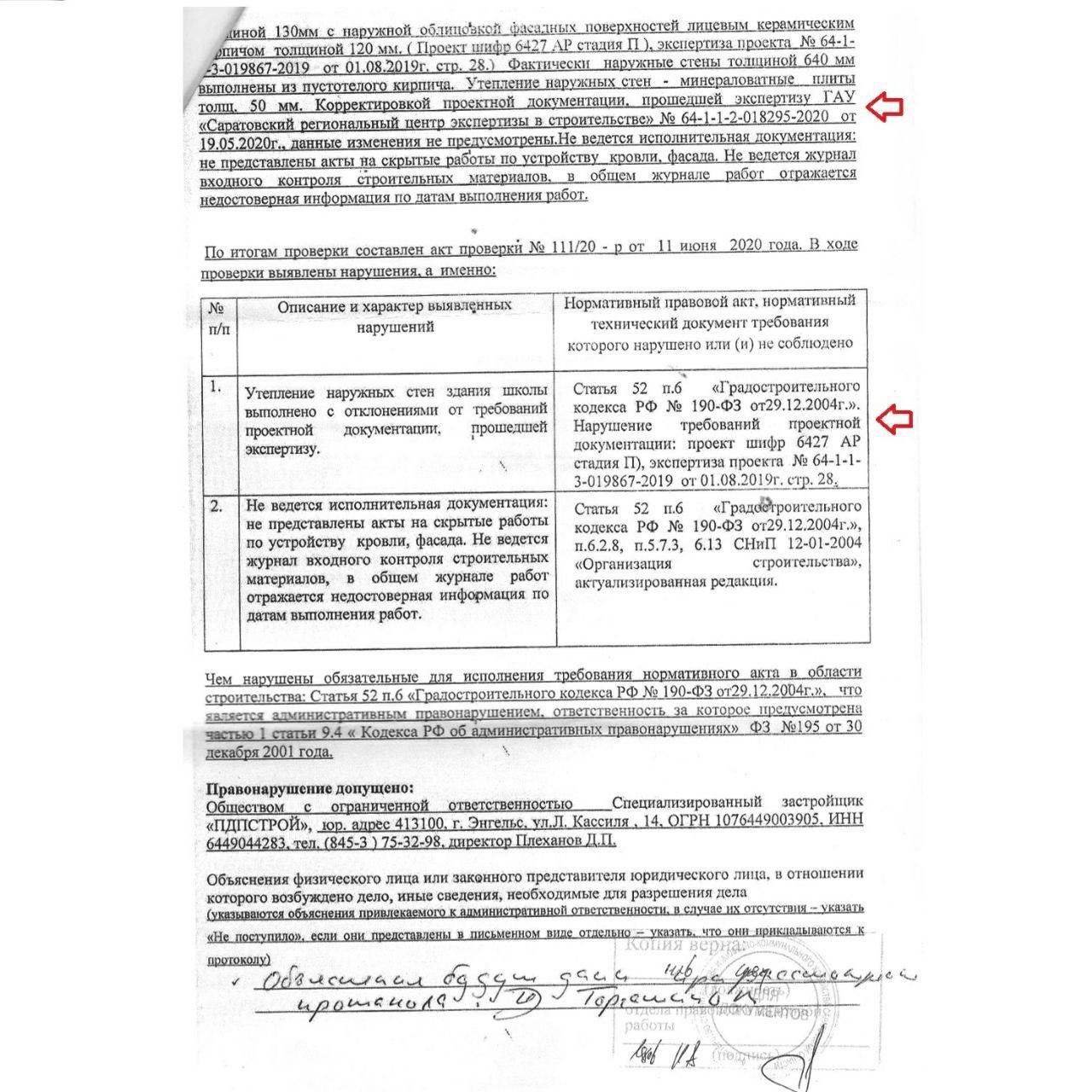 Министерством строительства и жилищно-коммунального хозяйства Саратовской области по запросу наших юристов были предоставлены документы, свидетельствующие об установленном факте нарушения обязательных требований в области строительства и применения строительных материалов и выполнении работ вразрез с требованиями проектной документации, прошедшей экспертизу ГАУ "Саратовский региональный центр экспертизы в строительстве".