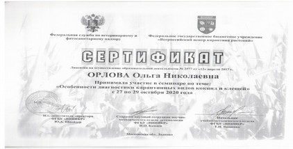 По окончанию курсов специалист отдела фитосанитарной экспертизы Орлова О.Н. получила сертификат.