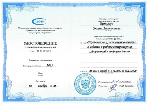 Начальник сектора мониторинга, планирования и отчетности ФГБУ «Саратовская МВЛ» в период с 16.11-18.11.2020 года приняла участие в обучении по программе повышения квалификации: «Требования к составлению отчета «Сведения о работе ветеринарных лабораторий» по форме 4-вет», форма очная с применением дистанционных образовательных технологий (Вебинар) в учебном центре ФГБУ «Центральная научно-методическая ветеринарная лаборатория».