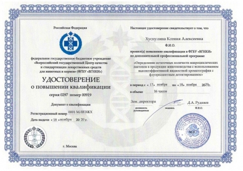 Химик отдела химических исследований прошла курсы повышения квалификации в ФГБУ «ВГНКИ», г. Москва, по теме: «Определение остаточных количеств макроциклических лактонов в продукции животноводства с использованием высокоэффективной жидкостной хроматографии с флуоресцентным детектированием».